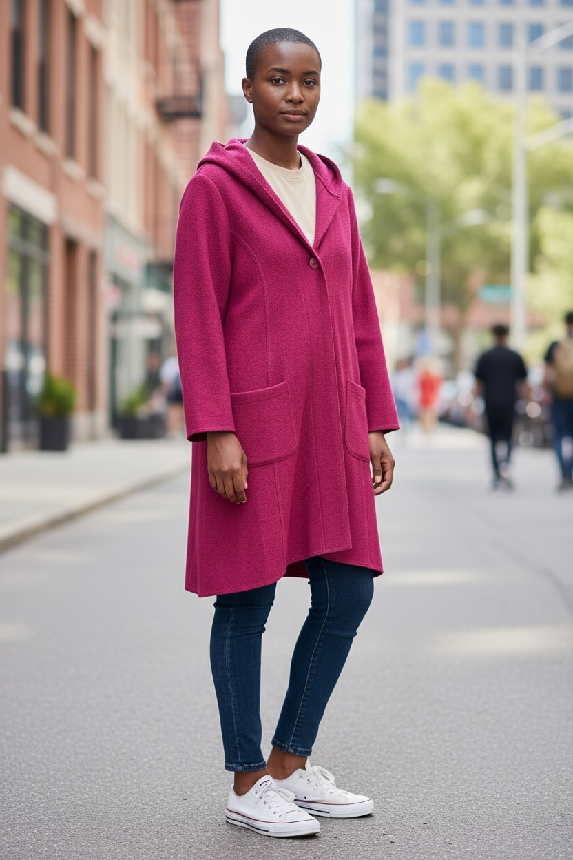 Elevate your fall and winter wardrobe with the NOEN Pink Cardigan Coat. This stylish hot pink coat features a cozy hood, convenient pockets, and a sleek single-button fastener, complemented by refined stitching details. Its cardigan-style design offers effortless layering for cooler days while adding a vibrant pop of color to any outfit. Ideal for sophisticated, comfortable warmth throughout the season.