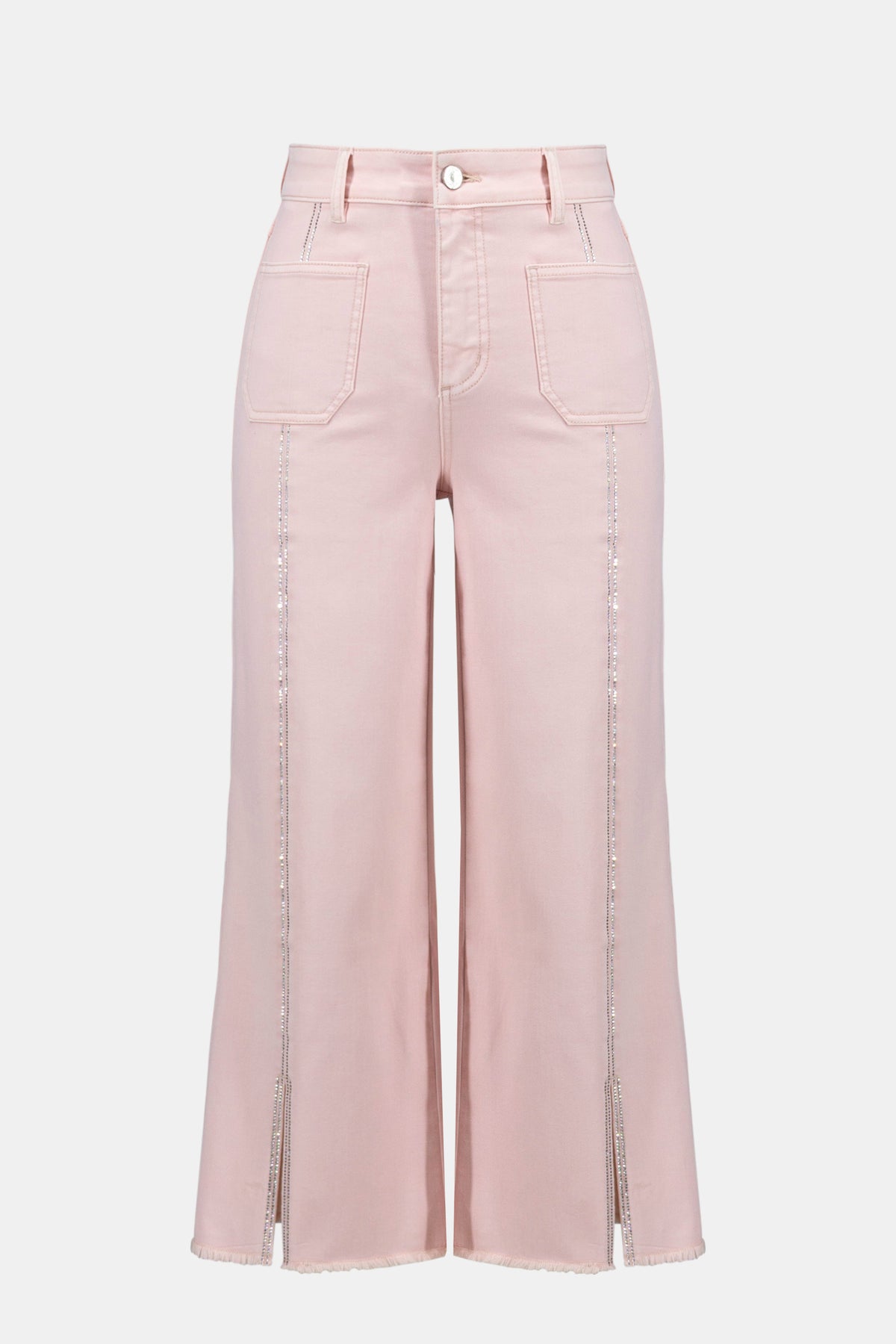 Elevate your denim game with these show-stopping pink culottes by Joseph Ribkoff. Soft pale pink fabric pairs beautifully with sparkling rhinestone details running down the seams for that extra glam factor. The cropped, wide-leg silhouette flatters every frame while a hint of stretch keeps you comfortable all day long. Perfect for dressing up casual looks or adding edge to your evening style.