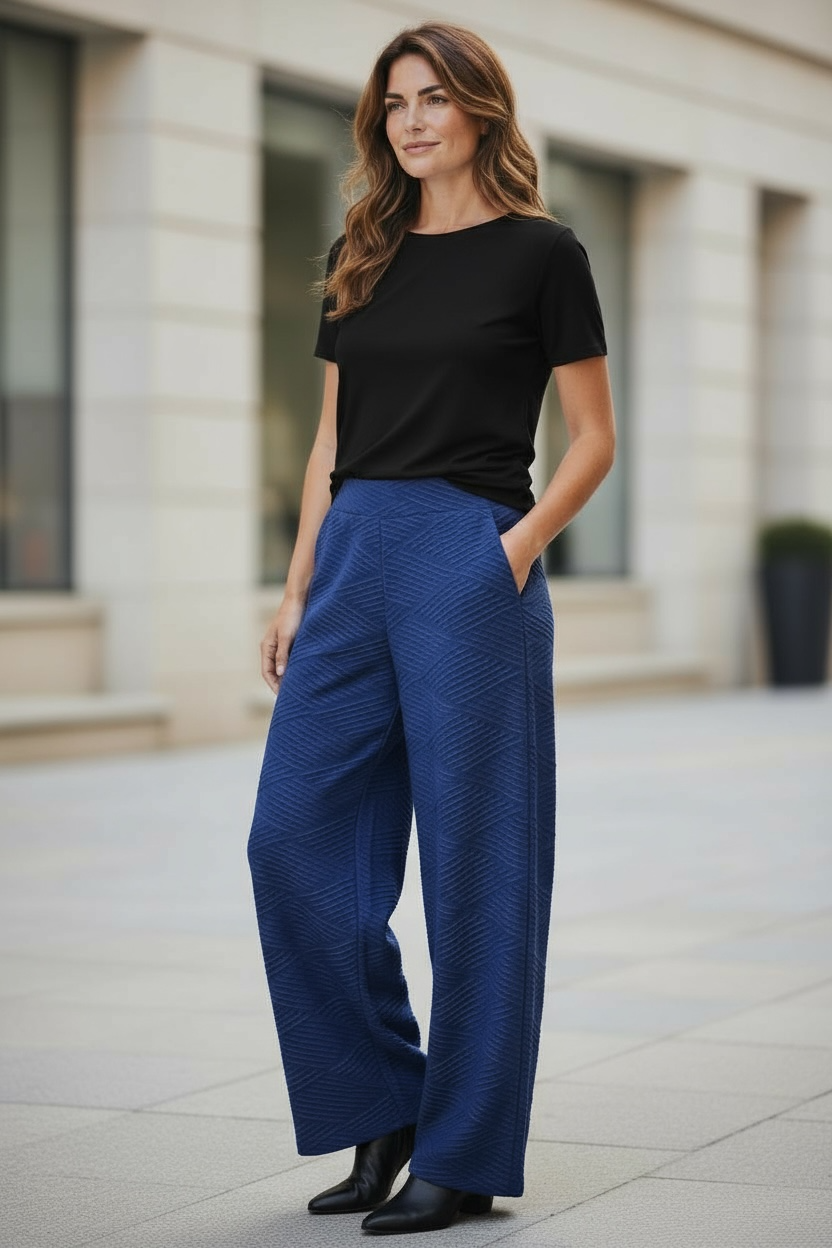 Step out in style with the PURE Essence Blue Pant! Featuring a comfy pull-on waist and handy pockets, these textured royal blue pants offer a flattering straight-leg fit that moves with you. Pair them with the matching layered duster (sold separately) for a look that’s effortlessly chic and uniquely you. Proudly made in Canada, these pants blend comfort and flair for your everyday adventures. Also available in Black on our site.